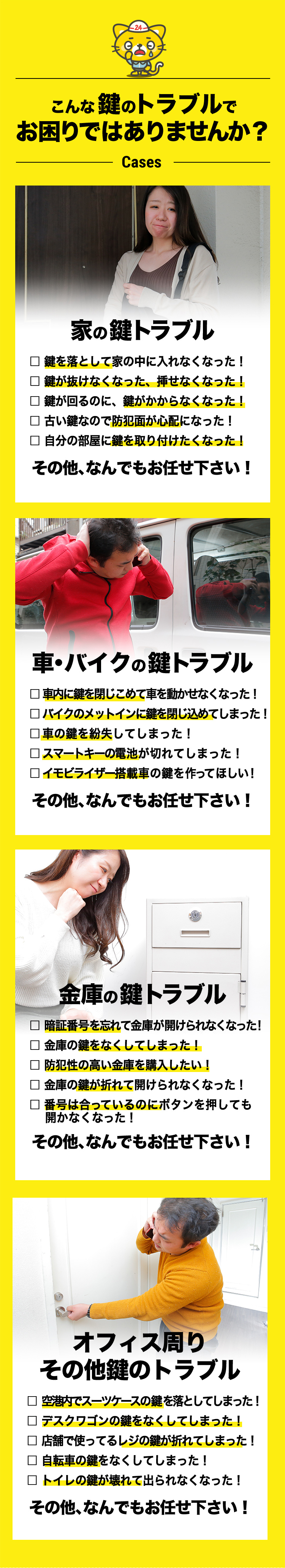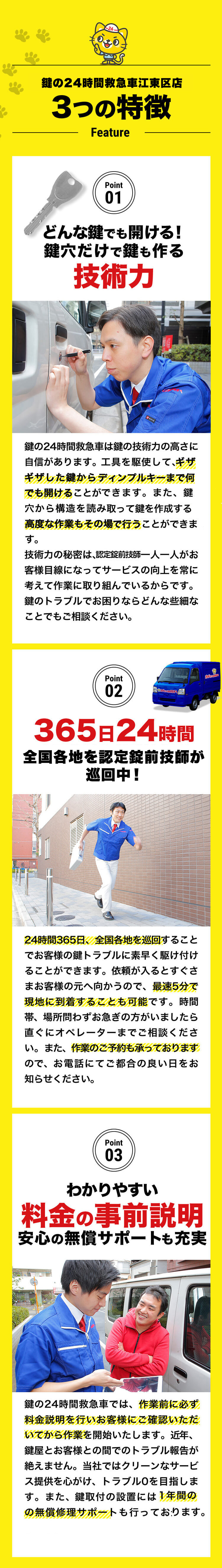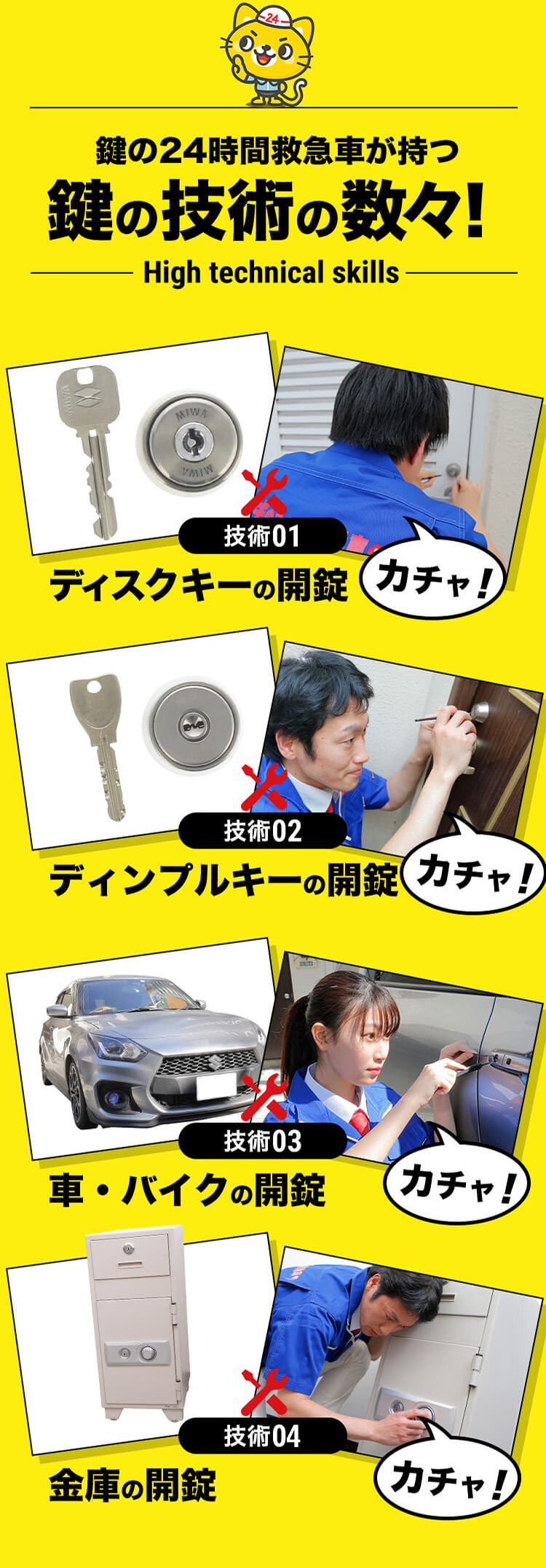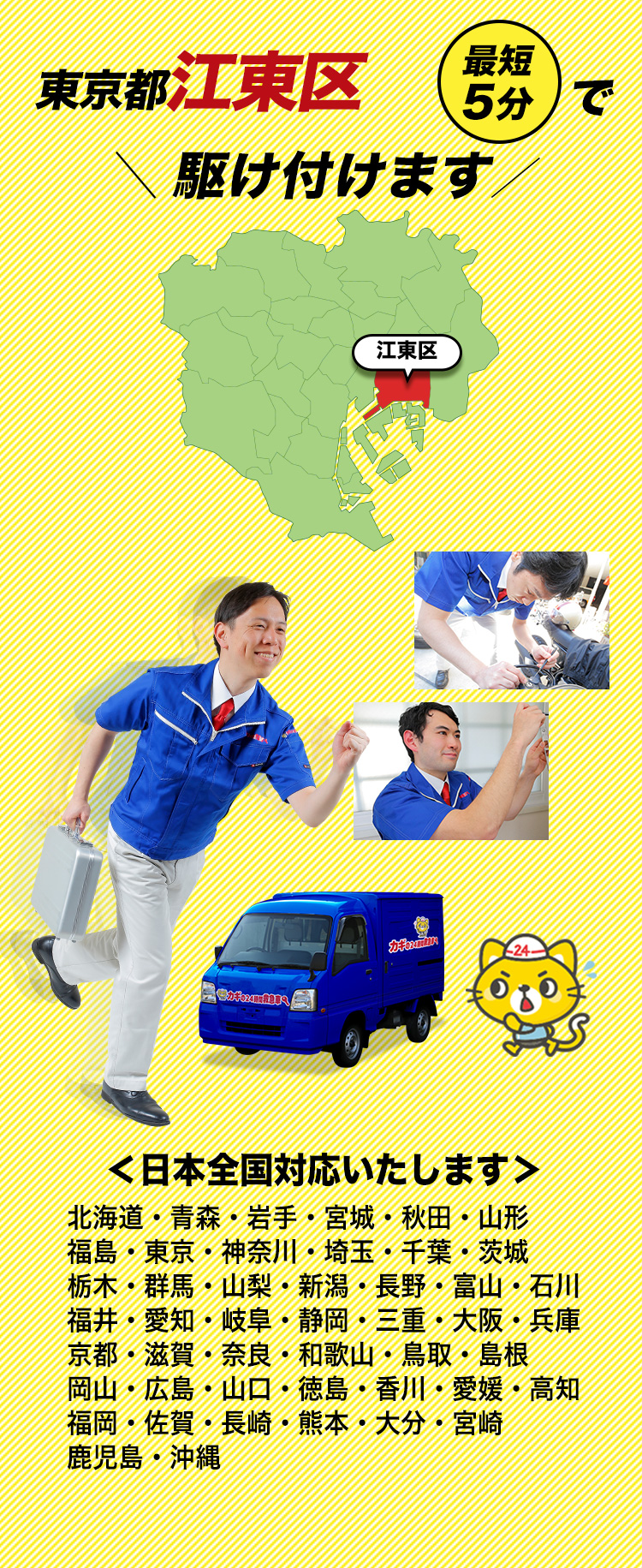 江東区で活動する「カギの出張24時間」は豊洲、門前仲町エリアで即時にご対応いたします。クリアな説明と精度の高い見積もりにより、お客様の信頼を確実に築いています。地域に根差した温かみのあるサービスで、施工後もお客様の声を大切にし、サービスの質を継続的に高めております。